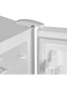 Внутри камеры — 4 полки из прочного закаленного стекла, большой выдвижной ящик для овощей и фруктов, а также 3 дверные полки для бутылок и упаковок. Посуда модели выполнена из прозрачного пластика со стильным серебристым отливом. Холодильная камера освещена LED-подсветкой, поэтому найти нужный продукт не составит труда.