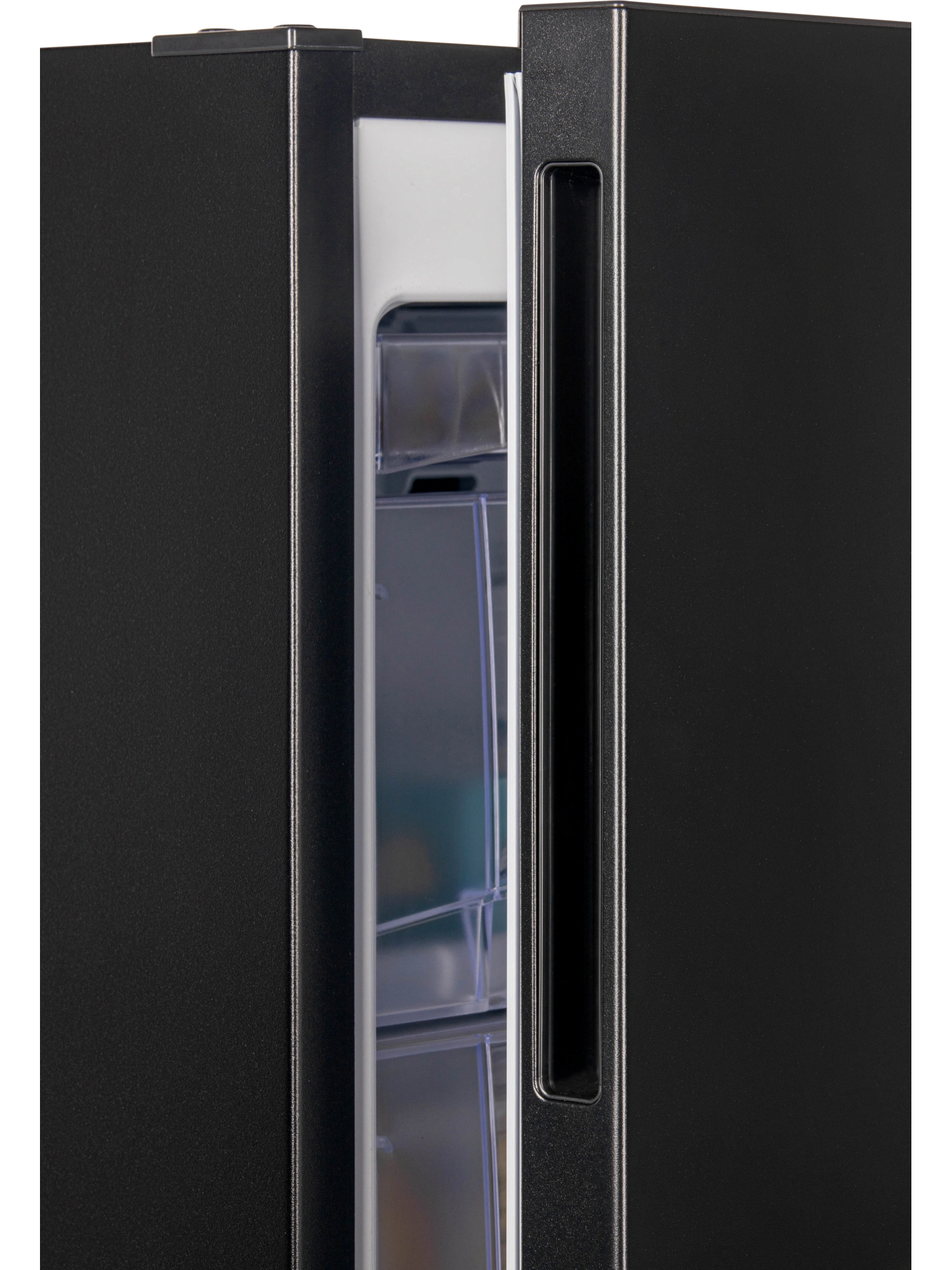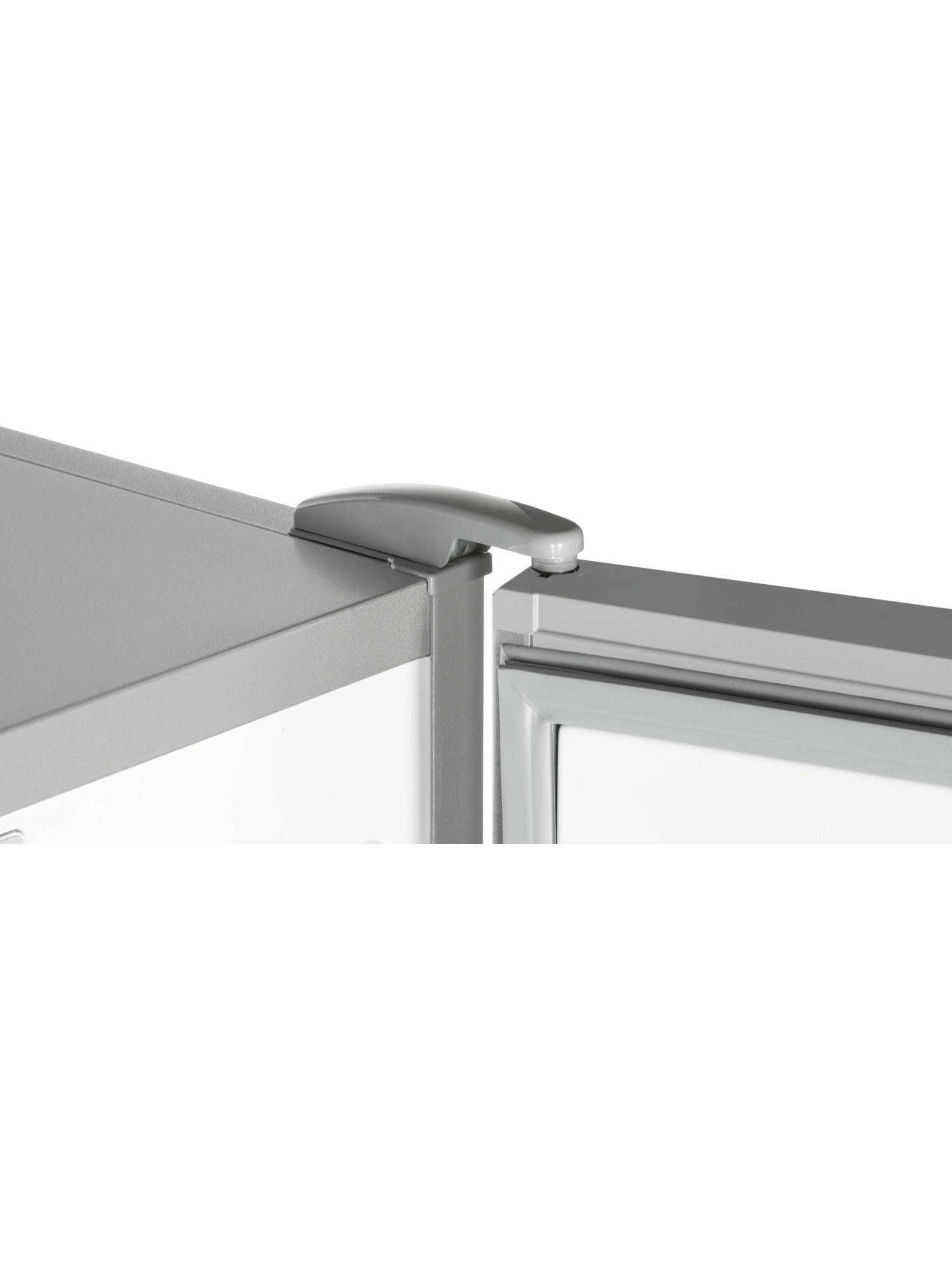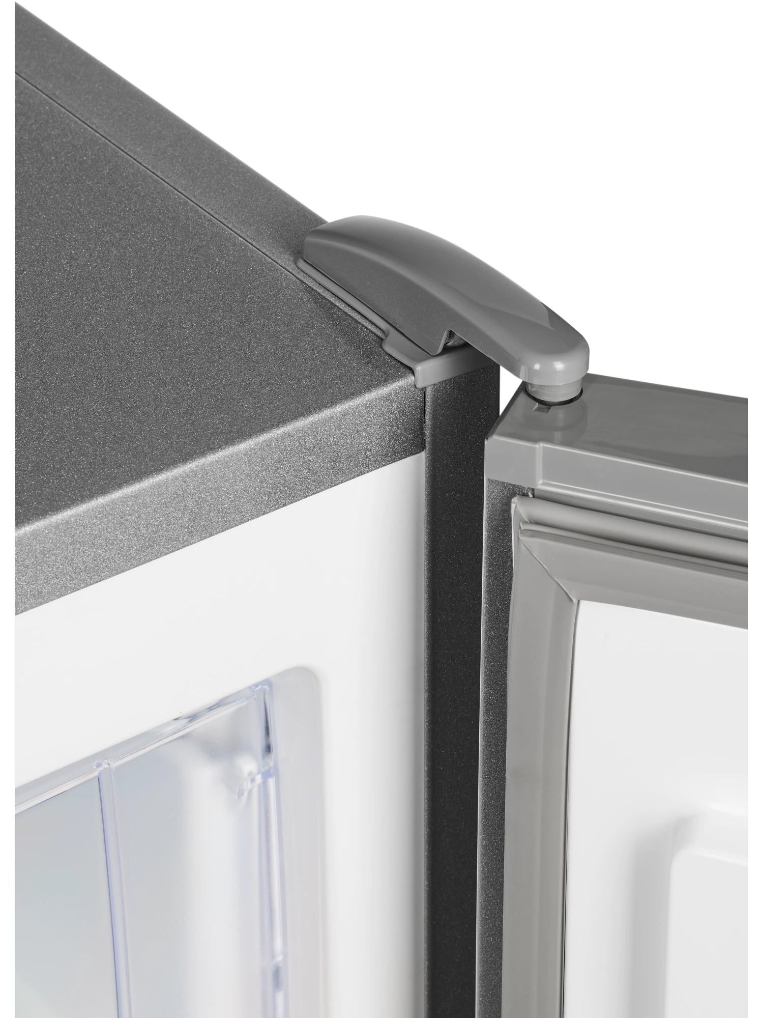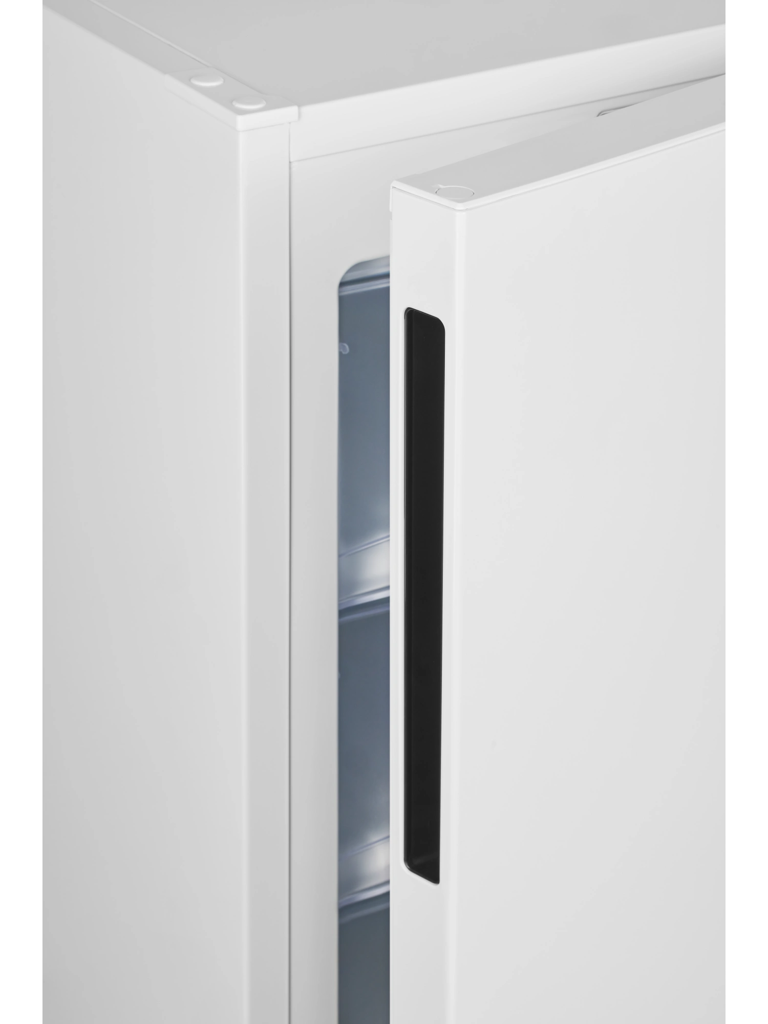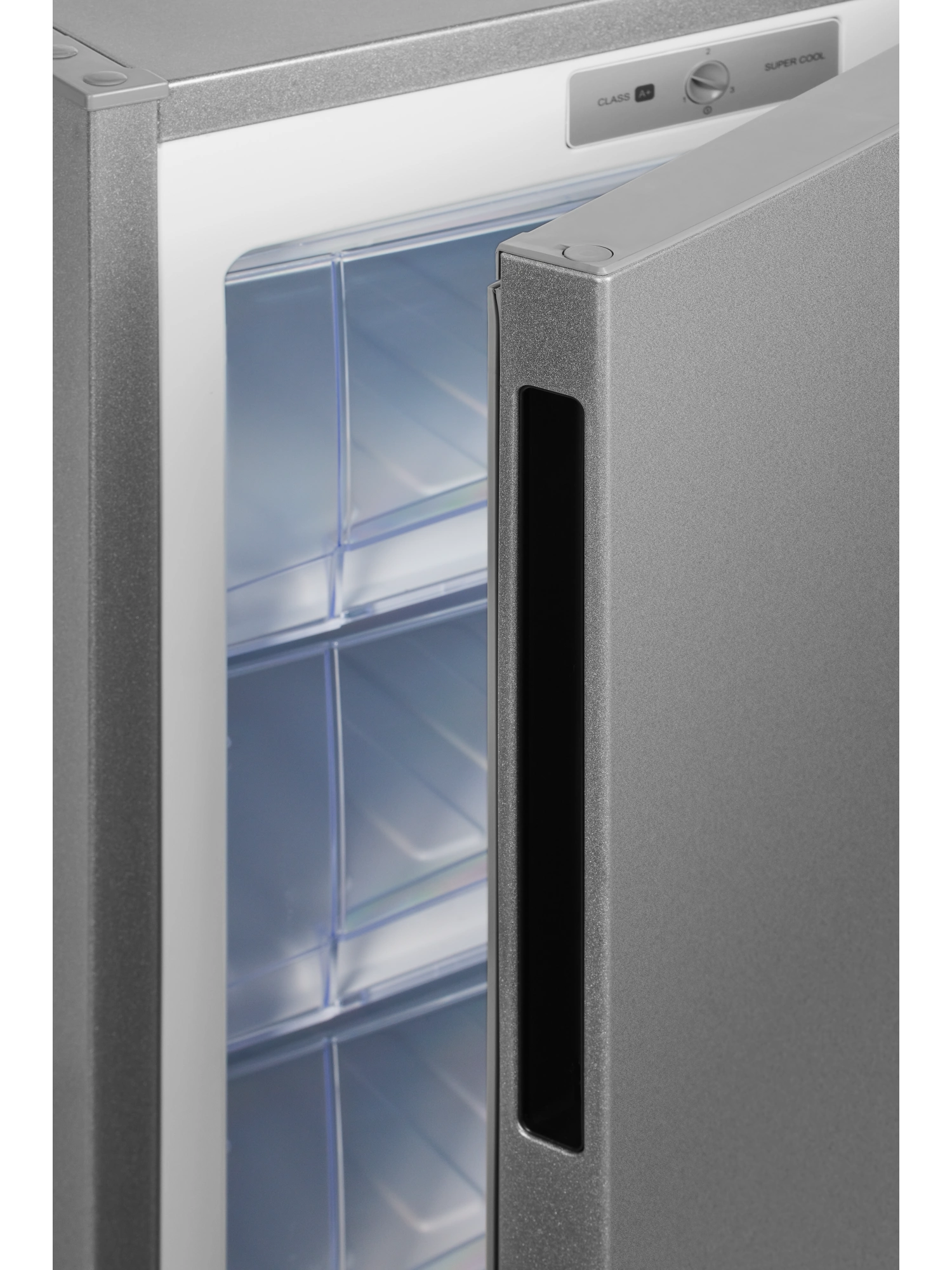Морозильник серебристого цвета с черной интегрированной ручкой и продуманным внутренним пространством станет стильным и технологичным акцентом на вашей кухне. Высота устройства 128 см. Для комфортного открытия и установки морозильника в удобном месте — дверь можно перенавесить с правой стороны на левую.