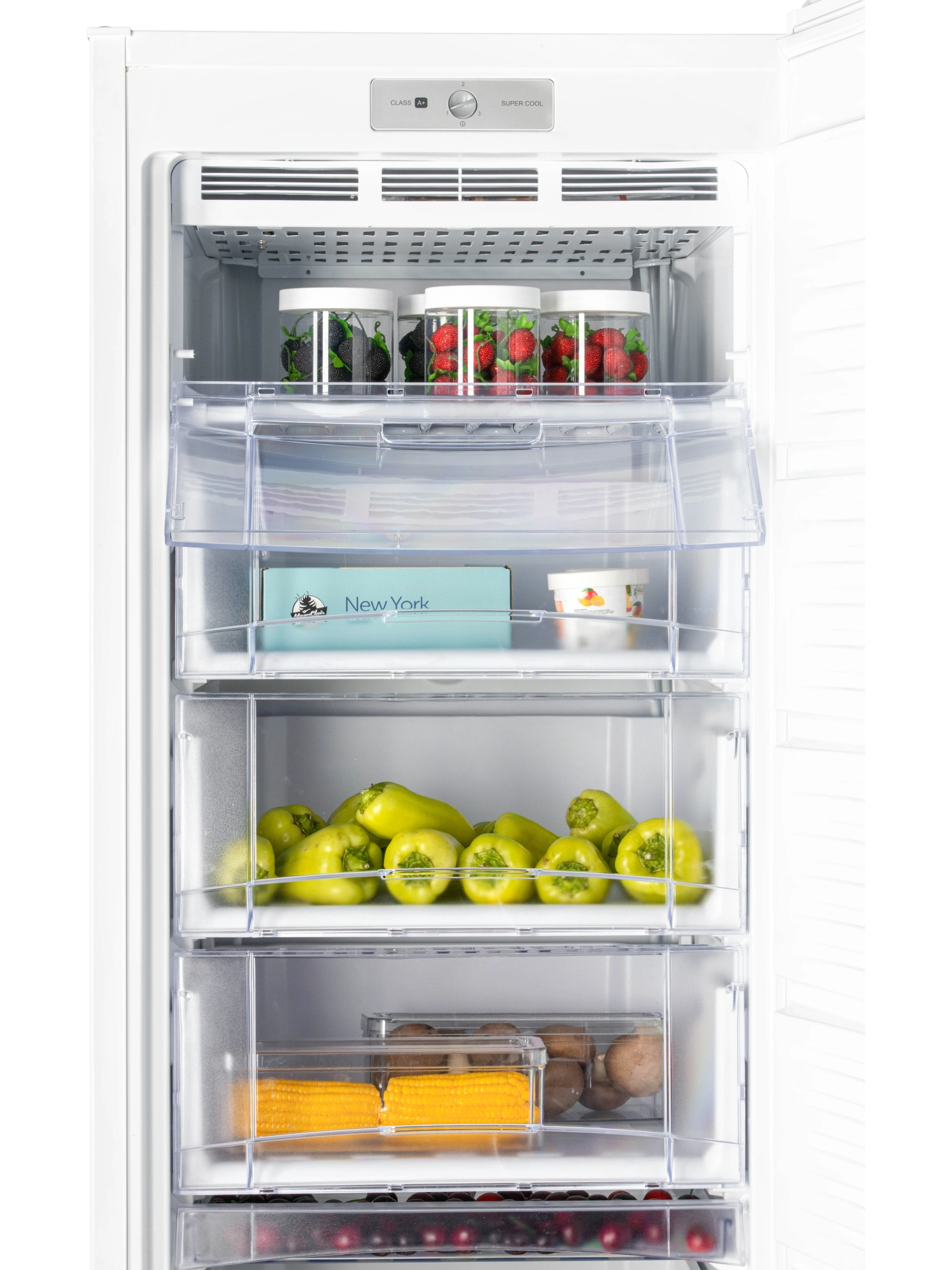Морозильник имеет 5 выдвижных прозрачных ящиков и форму для льда. Внутренняя поверхность модели имеет антибактериальное покрытие, которое предотвращает появление неприятных запахов и образование бактерий.