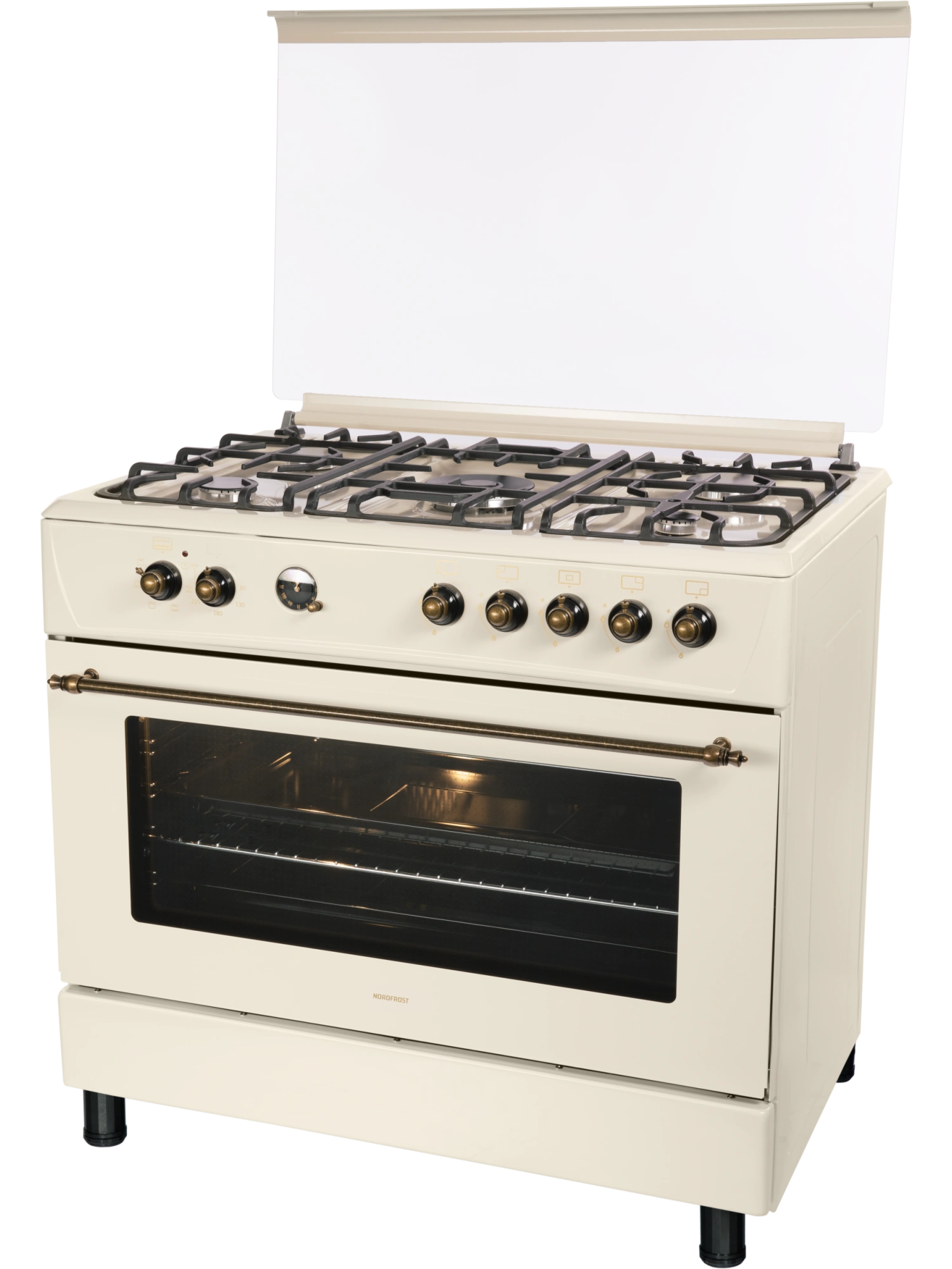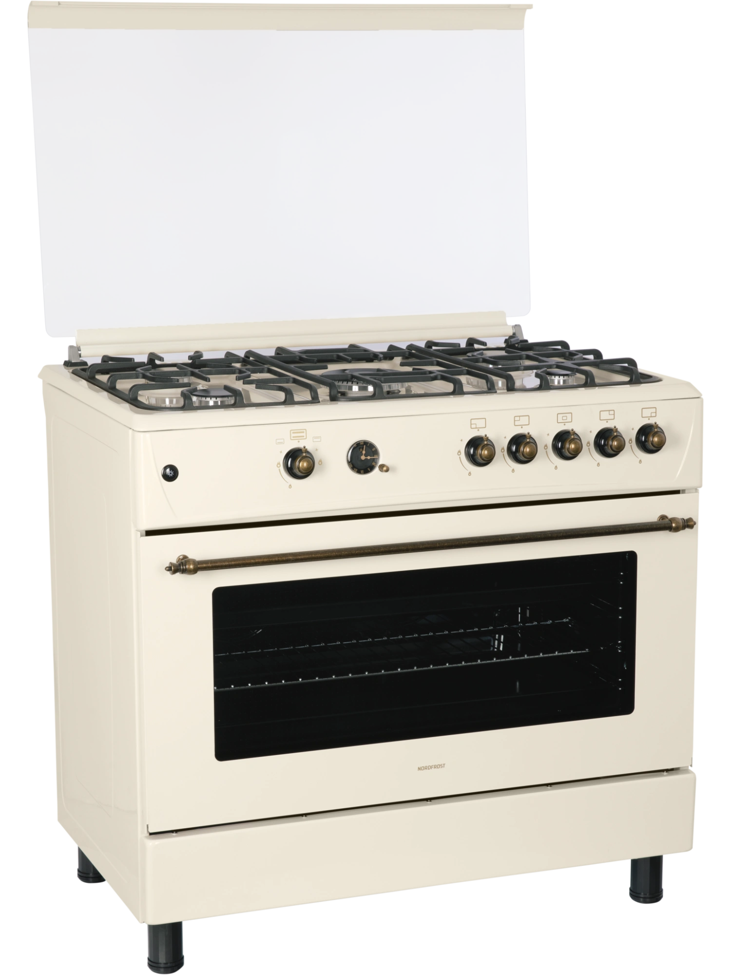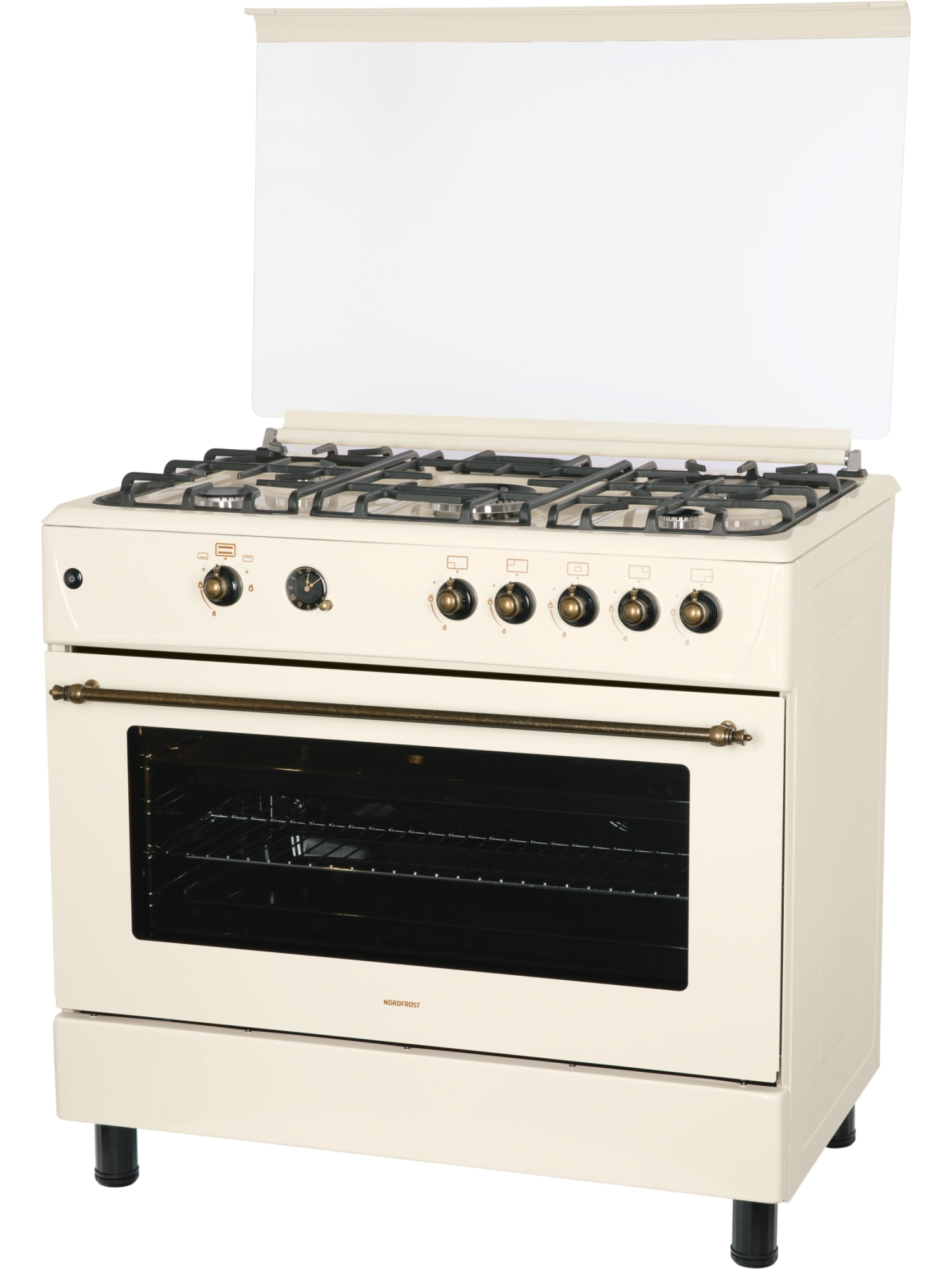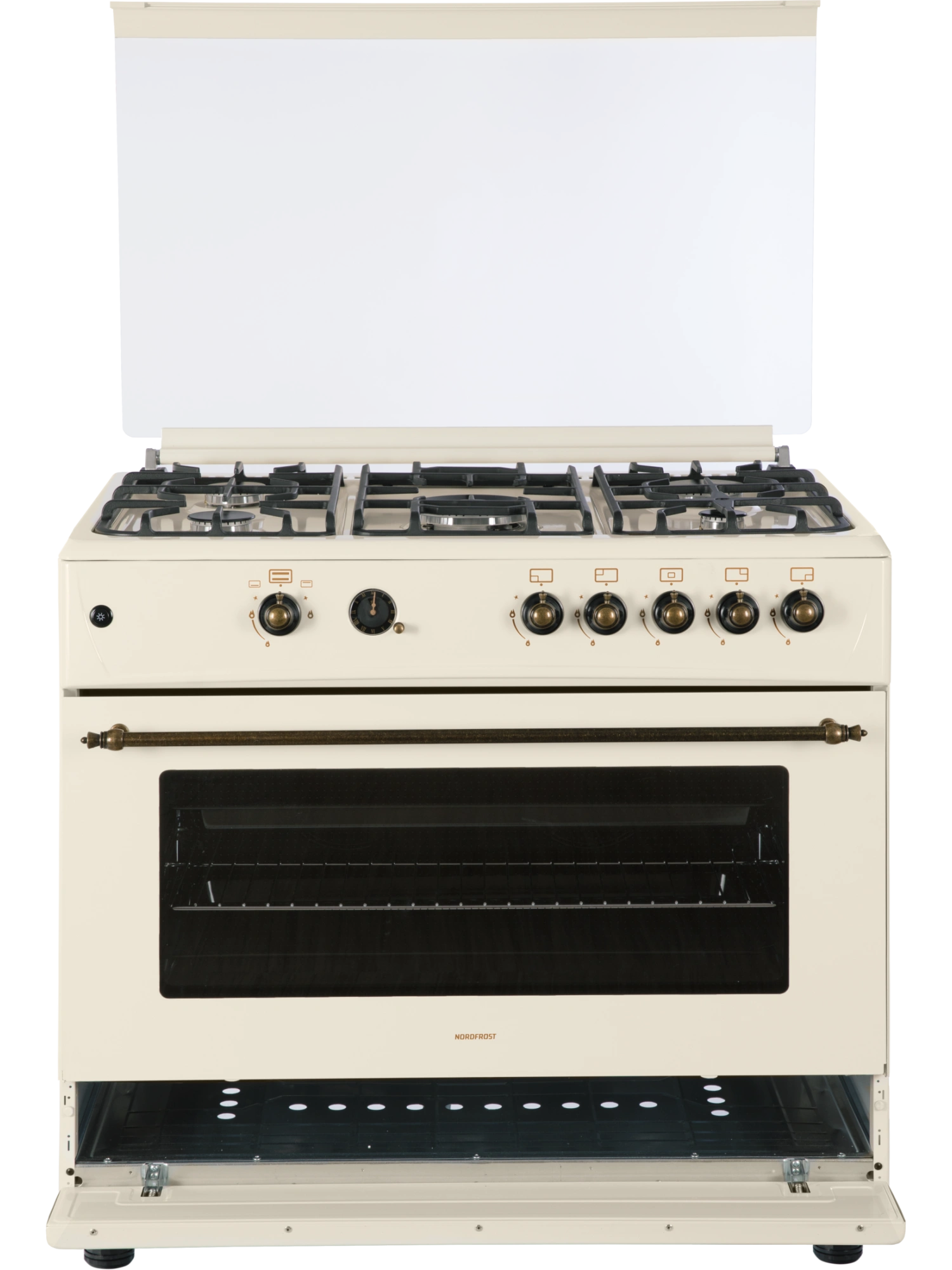Выполненная в ретро стиле широкая газовая плита NORDFROST GG 9062 YR имеет объем духовки 110 литров, оснащена 5 конфорками с функцией авторозжига.