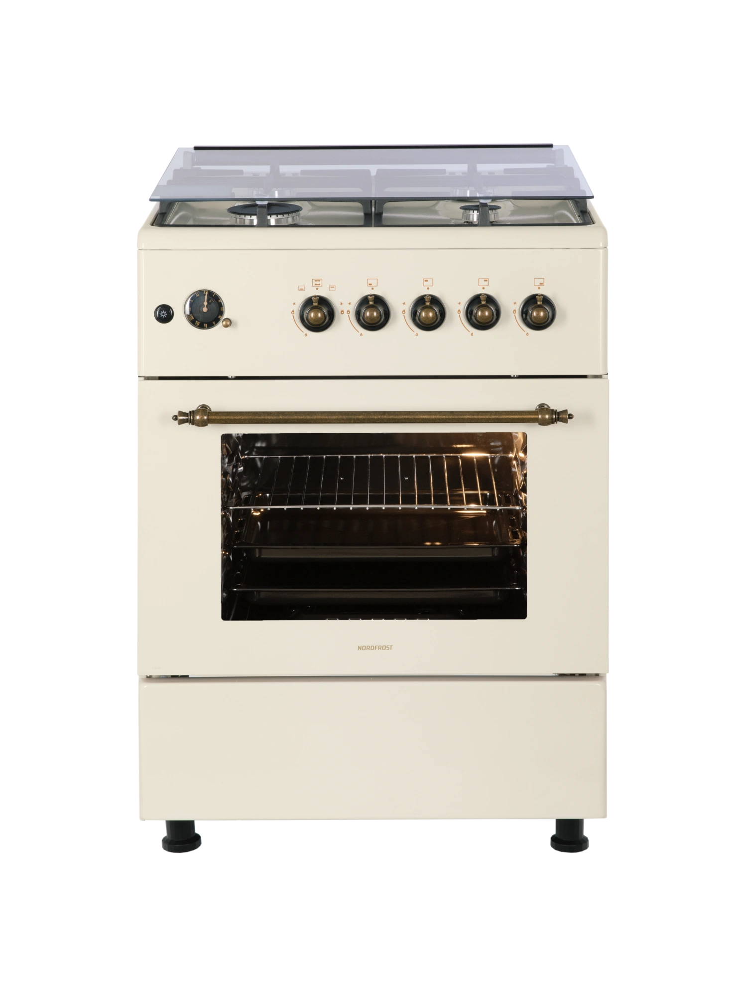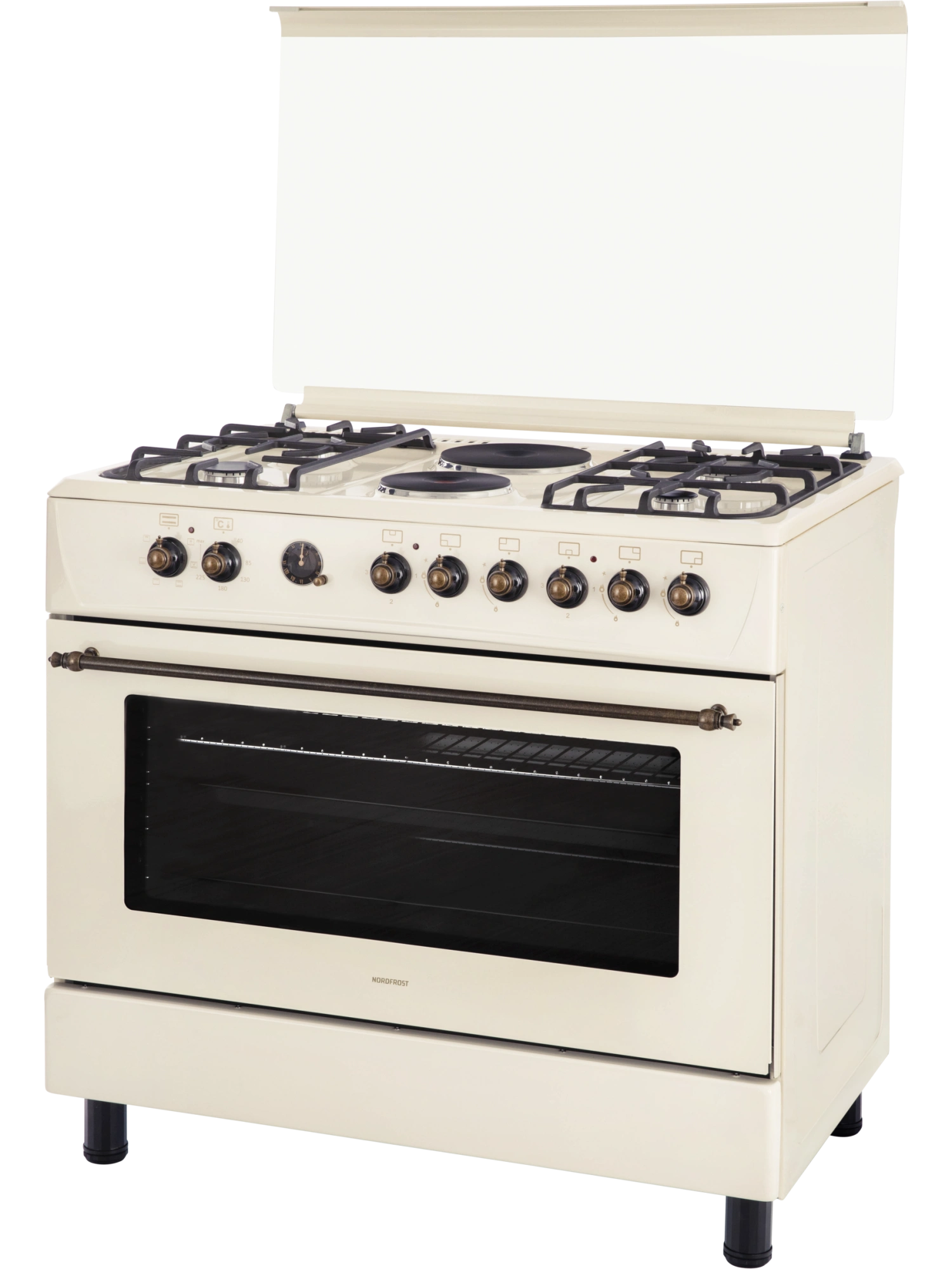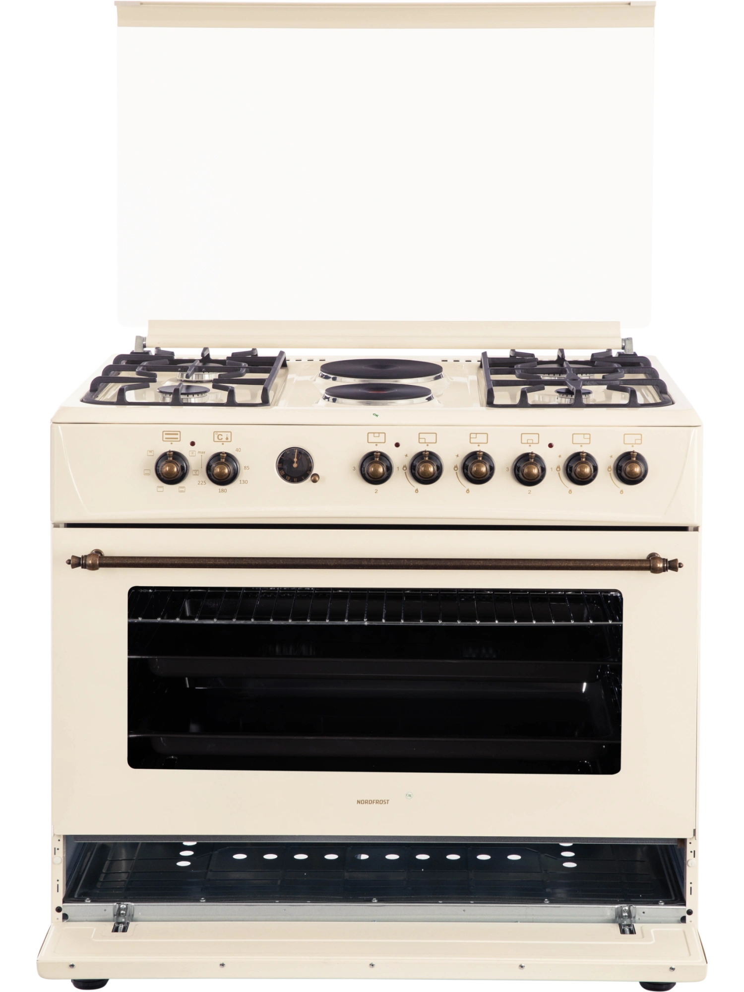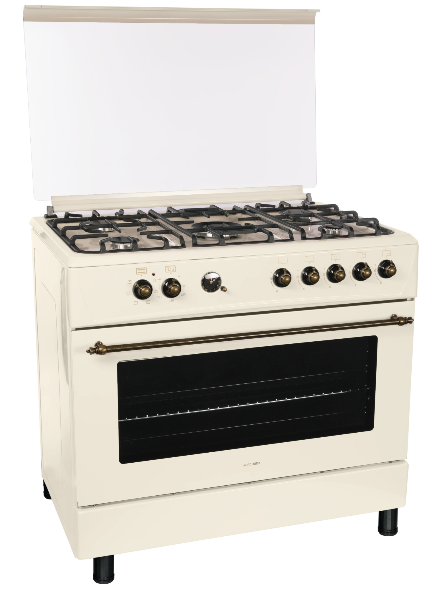 Выполненная в ретро стиле широкая газовая плита NORDFROST GG 9062 YR имеет объем духовки 110 литров, оснащена 5 конфорками с функцией авторозжига.