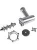 В комплект входят три перфорированные решётки разного диаметра для крупного, среднего и мелкого перемалывания, алюминиевый лоток, толкатель, а также насадка для кебаба.