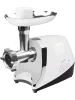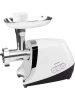 Корпус модели выполнен из белого пластика и металла, имеет хромированные детали. Мясорубка компактного размера не занимает много места, поэтому её можно удобно разместить на кухонном столе или хранить в шкафу. Прорезиненные ножки обеспечат устойчивое положение прибора на поверхности стола. Устройство может работать непрерывно до 5 минут и оснащено функцией защиты от перегрева.