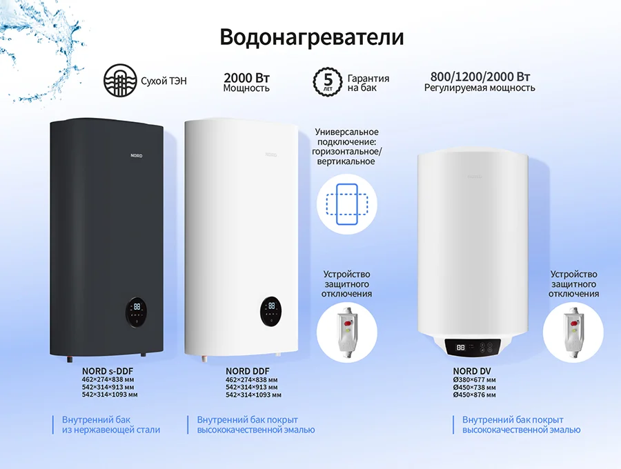 NORD представляет новую линейку накопительных электрических водонагревателей — DV, DDF и s-DDF в белом и черном исполнении. Объемы баков в 50, 80 и 100 литров позволят подобрать оптимальный вариант для ваших потребностей. Устройство – отличный выбор для квартиры или домовладения: стабильная горячая вода, простая установка и понятное управление.